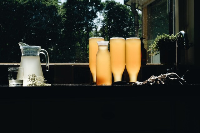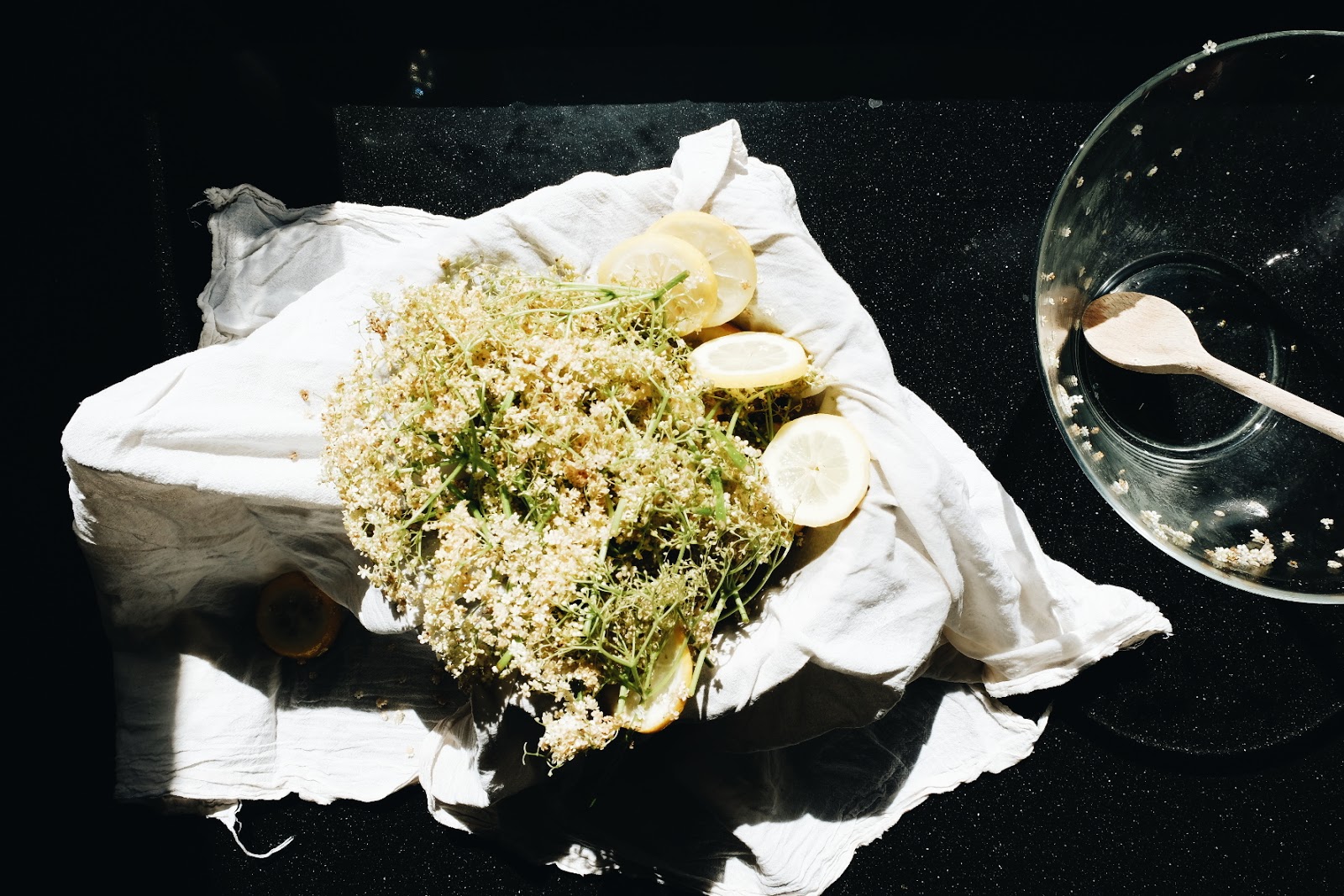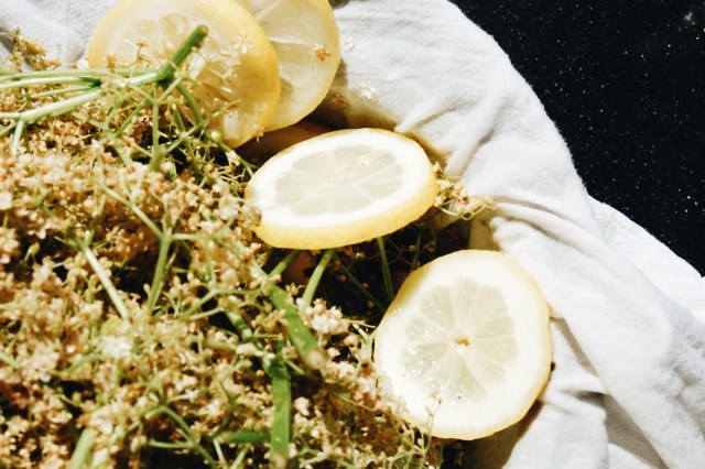 “Vul een glazen bokaal van 2 liter met vlierbloesem. Doe er twee in schijven gesneden (biologische) citroenen bij, overgiet het geheel met koud water en laat 24 uur op een warme plaats trekken.
