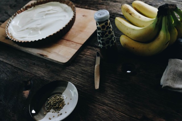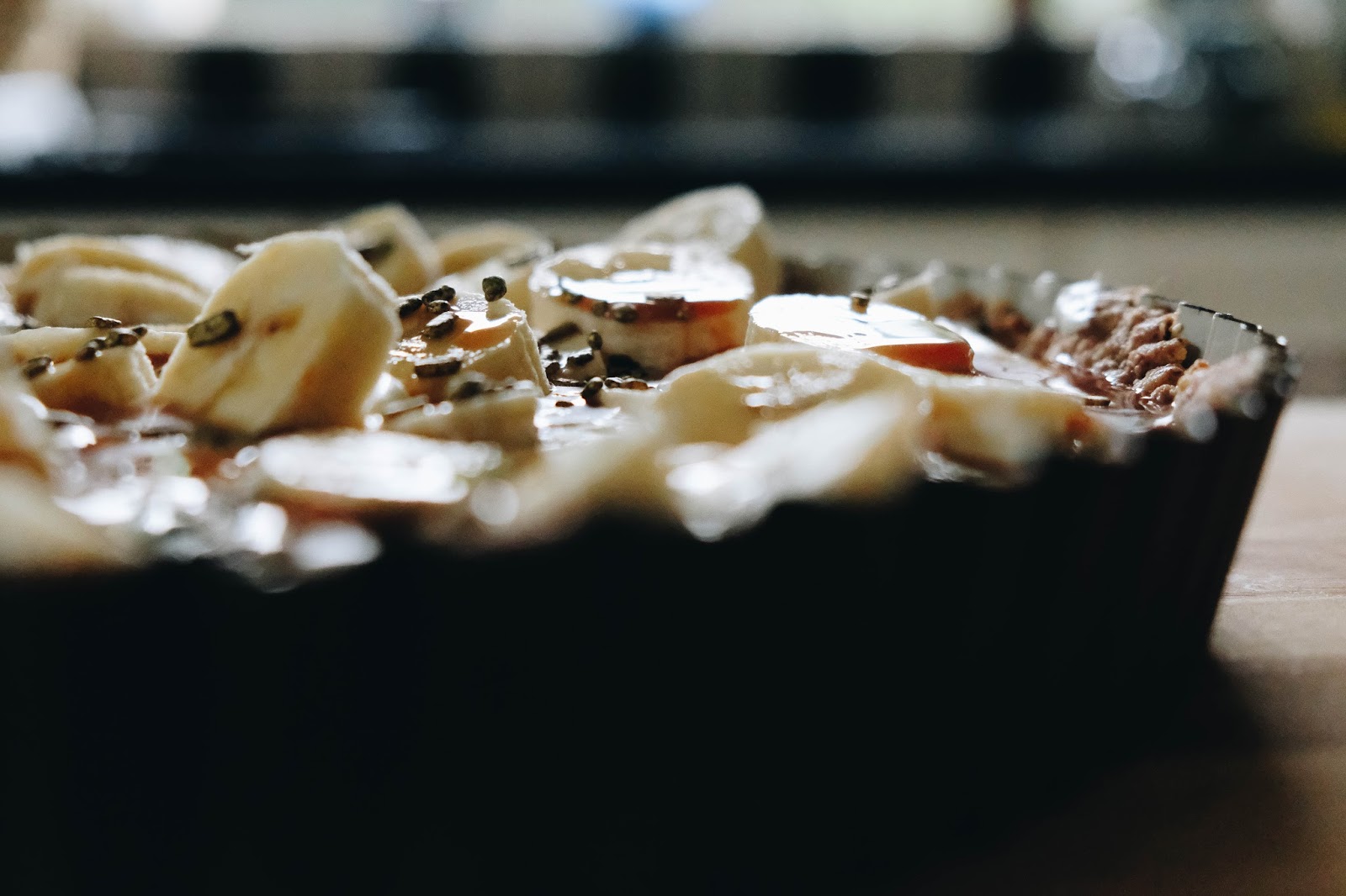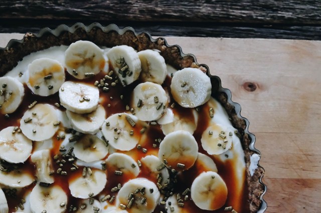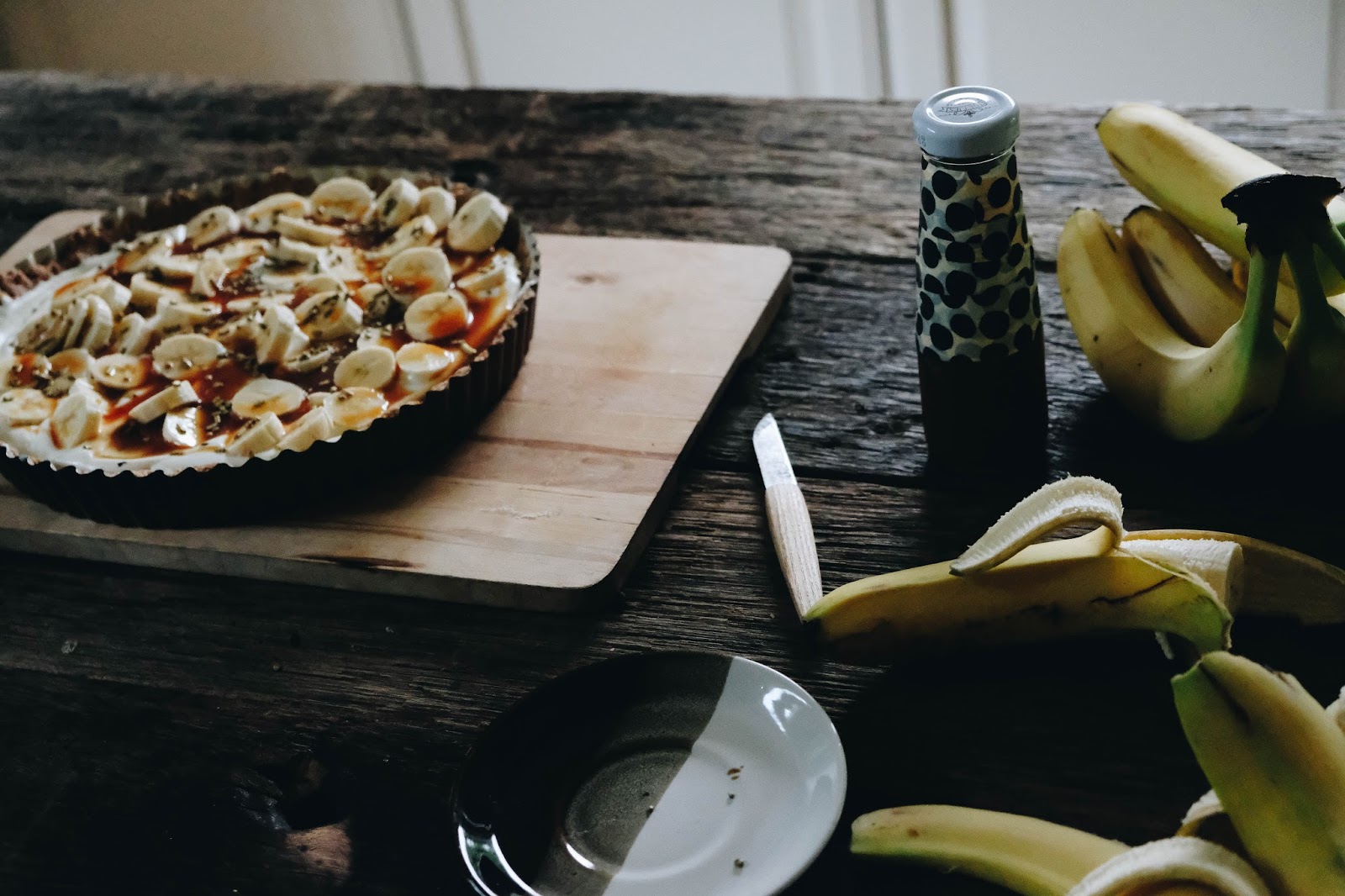 Ik maakte onlangs deze taart. Havermoutbodem, room en bananen met karamel en gouden spikkels. Lekker makkelijk te maken en ook heel lekker om op te eten. Spoiler alert; dit is niet geheel suiker- of E-nummervrij. Ik zeg het er maar even bij.