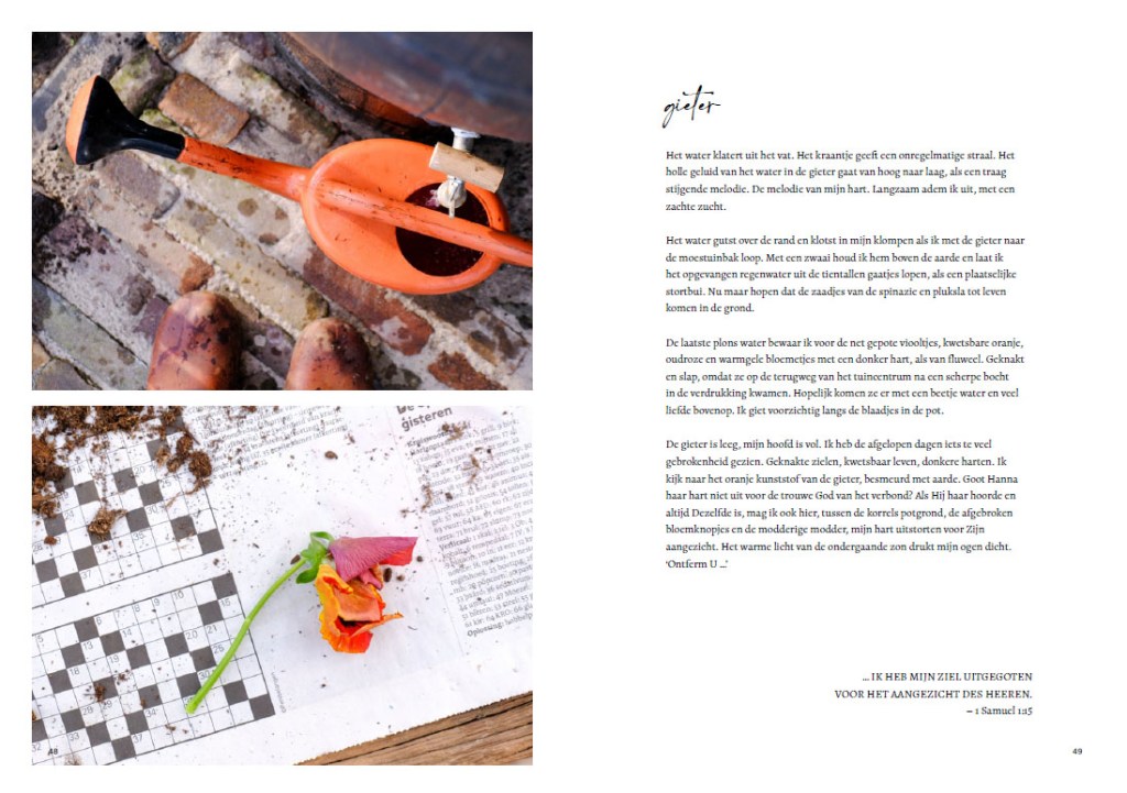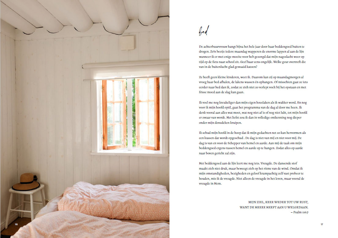 Tussen de ritmische bewegingen van het opruimen van de was en het doppen van de boontjes schrijf ik deze woorden op. Ik houd van het huis-, tuin- en keukenleven en voel me dankbaar. Bijzonder alledaags, dat is het leven. Veel van hetzelfde, maar overal schittert Zijn genade.”
